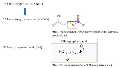 3-NOPは主にNOPAに分解され、NOPAは3-ニトロピオン酸(NPA)と酸素を除いてほとんど同じである。NOPAは牛乳に含まれる。以下を参照のこと。