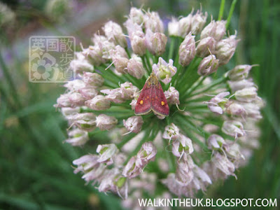 綺麗な色合いの、体長が1cmちょっとのハッカノメイガ (Mint Moth) です。ヨーロッパやアジアに広く分布しています。名前の通りミント系がお気に入りだそうで、この日も確か近くにキャットミントがあったような…